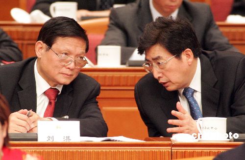 1月23日,北京市第十三屆人大一次會議舉行第三次全體大會,北京市委書記劉淇(左)、北京市代市長郭金龍出席并在會前進行交談。中新社發 張宇 攝