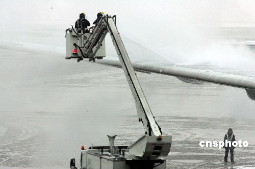 2月2日上午,2008年兩岸春節包機上海航點首個航班——東航MU五00七次航班,冒著數十年未遇的罕見風雪在上海浦東機場起飛。圖為浦東機場為春節包機優先提供特別的除冰服務。中新社發 潘索菲 攝