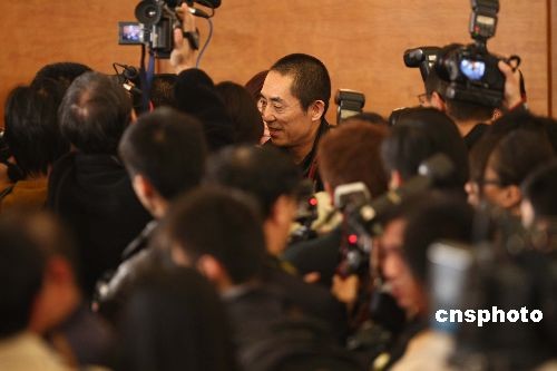 3月12日,全國政協(xié)十一屆一次會(huì)議記者招待會(huì)在北京人民大會(huì)堂新聞發(fā)布廳舉行,主題是“政協(xié)委員談奧運(yùn)”。著名導(dǎo)演、北京奧組委開幕式總導(dǎo)演張藝謀在發(fā)布會(huì)結(jié)束后被媒體重重包圍,難于脫身。中新社發(fā) 盛佳鵬 攝