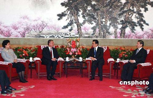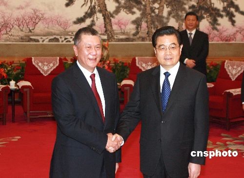 3月18日,中國國家主席胡錦濤在北京中南海會見了來京列席十一屆全國人民代表大會一次會議的澳門特別行政區行政長官何厚鏵。中新社發 廖文靜 攝