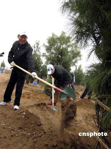 3月22日,來自中國國務院各部門的172名部級領導在北京郊區門頭溝區揮鍬鏟土,栽下了白皮松、銀杏、國槐、欒樹等30多個樹種2000多株樹木,為綠色奧運再添新綠。圖為外交部部長楊潔篪在為樹苗填土。中新社發 于立霄 攝