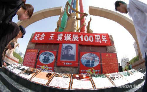 4月11日下午,是王震同志誕辰100周年紀念日。新疆巴州紅色收藏家陳伯壽在庫爾勒人民廣場免費展出王震圖片和資料。當日,新疆各地州舉辦座談會、展出王震圖片和資料等形式紀念王震同志誕辰100周年。中新社發 確·胡熱 攝