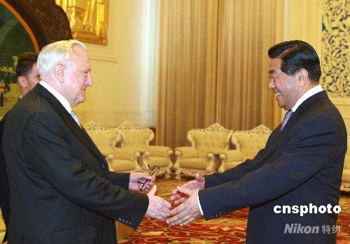4月25日,全國政協主席賈慶林在北京人民大會堂會見法國參議院議長克里斯蒂安·蓬斯萊。中新社發 廖文靜 攝