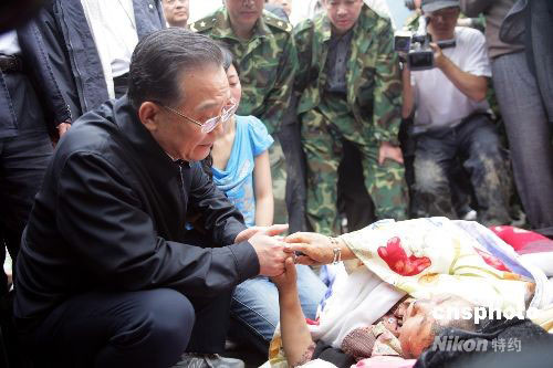 圖:溫家寶在汶川映秀看望災(zāi)民