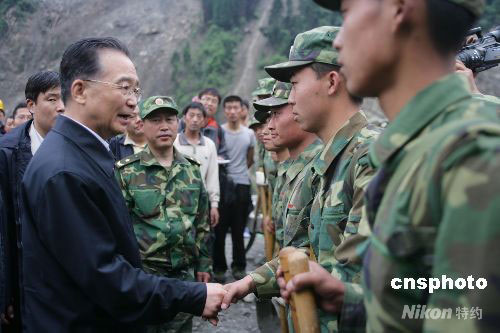 5月14日下午,國務(wù)院總理溫家寶在地震災(zāi)區(qū)看望救災(zāi)武警官兵。中新社發(fā) 劉震 攝