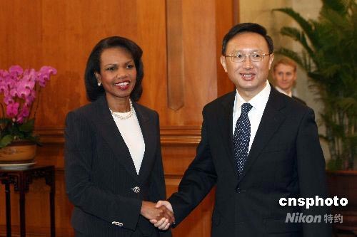 6月29日,中國外交部部長楊潔篪在北京釣魚臺國賓館與美國國務卿賴斯舉行會談。中新社發 盛佳鵬 攝