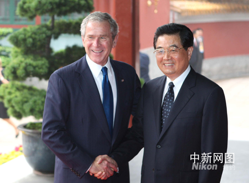 中國國家主席胡錦濤今天在中南海瀛臺會見美國總統布什。中新社記者 廖文靜攝