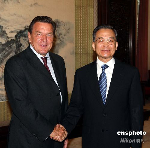 八月十日,中國國務院總理溫家寶在北京中南海會見德國前總理施羅德。中新社發 任海霞 攝