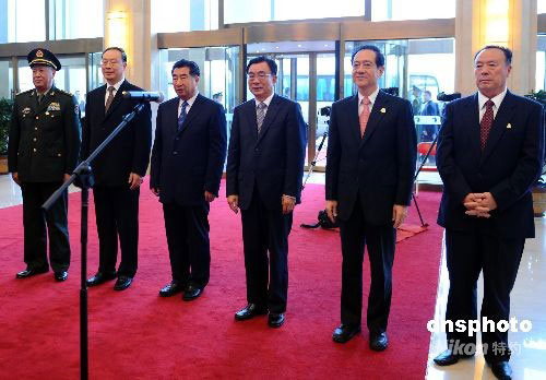 9月23日,中央代表團團長賀國強(右三)、副團長回良玉(左三)、韓啟德(右二)、杜青林(左二)、白立忱(右一)、陳炳德(左一)出席寧夏回族自治區成立50周年相關活動。中新社發 廖攀 攝