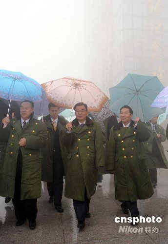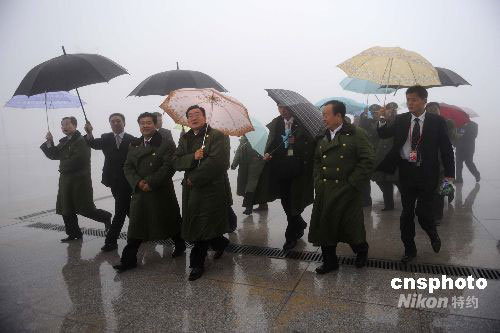 9月25日,寧夏六盤山寒雨紛飛,賀國強率團冒雨參觀位于六盤山主峰上的六盤山紅軍長征紀念館。當日,賀國強率中央代表團一分團繼續在寧夏固原市展開慰問。中新社發 廖攀 攝