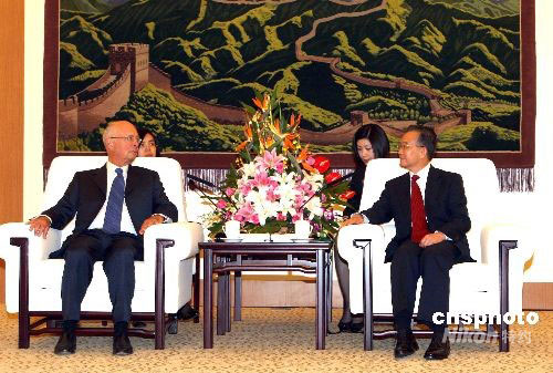 9月27日,在天津出席2008夏季達(dá)沃斯論壇的中國總理溫家寶,會見世界經(jīng)濟(jì)論壇主席施瓦布。中新社發(fā) 張宇 攝