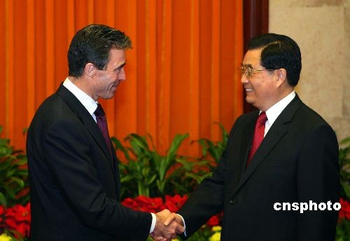 10月22日,中國國家主席胡錦濤在北京人民大會(huì)堂會(huì)見前來出席第七屆亞歐首腦會(huì)議的丹麥?zhǔn)紫嗬鼓律V行律绨l(fā) 廖文靜 攝