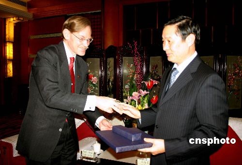 12月14日,世界銀行行長佐利克一行在成都會見了四川省委書記劉奇葆,兩人就全球經(jīng)濟(jì)危機(jī)影響下雙方在四川災(zāi)后重建和成都統(tǒng)籌試驗(yàn)區(qū)建設(shè)等方面的合作意愿交流了看法。圖為佐利克(左)與劉奇葆(右)互贈禮物。中新社發(fā) 黃永莉 攝