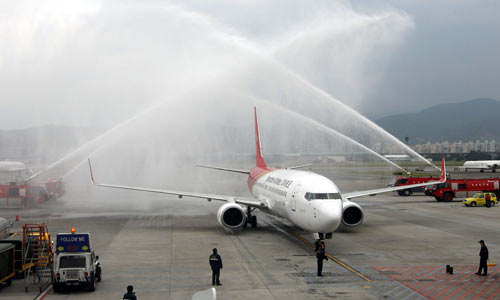 2008年12月15日,深圳航空首航臺灣的第一班平日包機在臺北松山機場降落。松山機場方面以噴水方式表示歡迎。兩岸常態包機直航從此開始營運。(“中央社”圖)