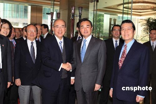 12月19日中午,中國國民黨主席吳伯雄一行乘直航包機抵達上海,準備出席將于二十日至二十一日在上海舉行的第四屆兩岸經貿文化論壇。中共中央臺辦主任王毅在香格里拉酒店迎候吳伯雄一行。中新社發 潘索菲 攝
