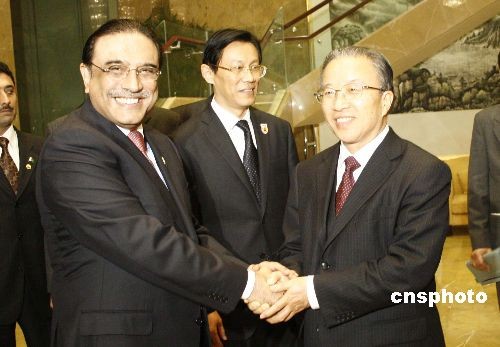 2月21日晚,中國國務委員戴秉國代表中國政府在武漢會見了到訪的巴基斯坦總統扎爾達里。應中國政府邀請,20日至23日,扎爾達里總統將先后訪問湖北和上海,考察中國水利、農業、金融等領域發展情況。中新社發 艾啟平 攝