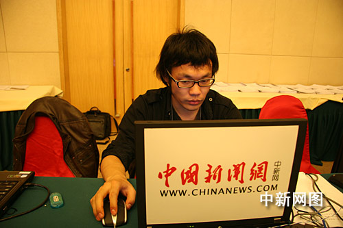 3月6日下午,出席十一屆全國人大二次會議的5位企業家代表在大會新聞中心(梅地亞中心多功能廳)就“企業如何應對國際金融危機的挑戰”接受中外記者的采訪。圖為本網記者在現場進行直播。中新網記者 唐偉杰 攝