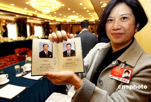 3月6日,香港溢達集團董事會副主席楊敏德在香港界分組討論會上,拿著大會特制的香港特別行政區政協委員通訊錄讓委員們簽名。中新社發 傅丹丹 攝