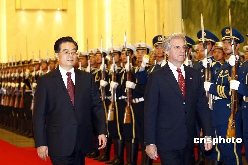 3月23日,中國國家主席胡錦濤在北京人民大會堂舉行儀式歡迎烏拉圭總統巴斯克斯訪華。中新社發 盛佳鵬 攝
