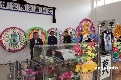 4月22日,“雪龍?zhí)枴睒O地科考船失事直升機失蹤機組人員楊永昌追悼會在上海長興島殯儀館舉行,與楊永昌生前一同到極地從事科考的隊友專程為楊永昌送行。4月12日,“雪龍?zhí)枴睒O地科考船租用的艦載直升機在完成科考任務(wù)后返回駐地時失事墜海。4名機組人員隨機落水,其中3人獲救。4月20日,經(jīng)過近8天的搜尋,失蹤機組人員楊永昌的遺體在長江口水域振華港機0號碼頭附近被發(fā)現(xiàn)并打撈上岸。中新社發(fā) 潘索菲 攝