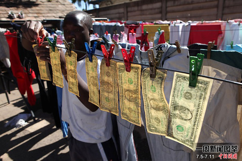 7月6日周二,津巴布韋哈拉雷,阿萊克斯•姆龐迪晾曬清洗過的美鈔。據當地人說,這些美鈔流通到本國時因異味太濃無法使用。去年津巴布韋政府宣布美元為法定貨幣。