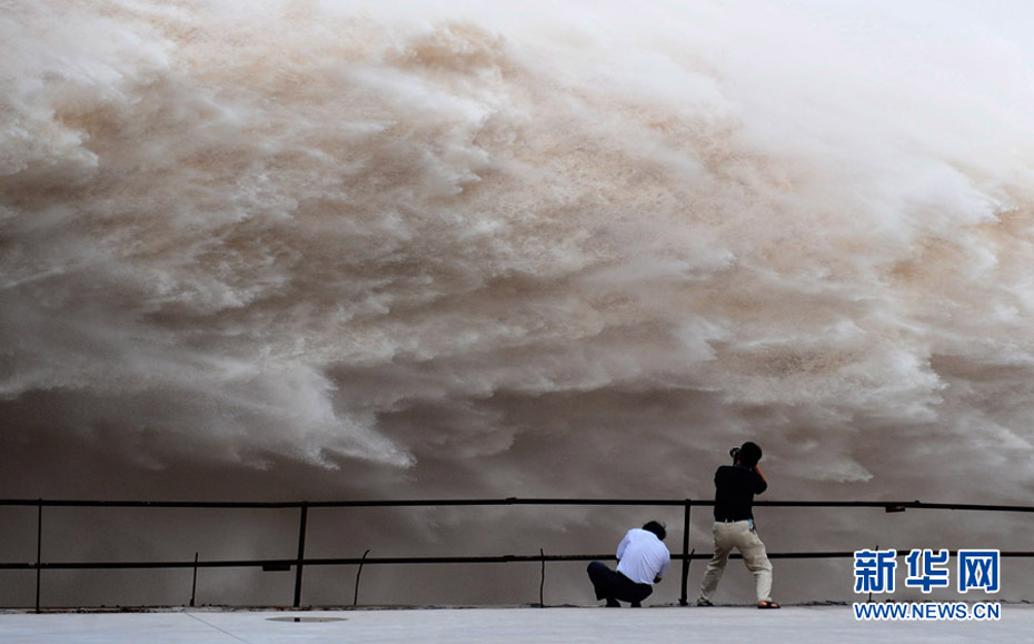 7月20日8時,峰值為7萬立方米/秒的洪水抵達三峽大壩。這是三峽工程建成后的首次大規模洪峰。大壩共開啟9個泄洪深孔,將洪水下泄流量控制在4萬立方米/秒左右,削減了4成多的洪峰下泄流量。中新社發 劉良偉 攝