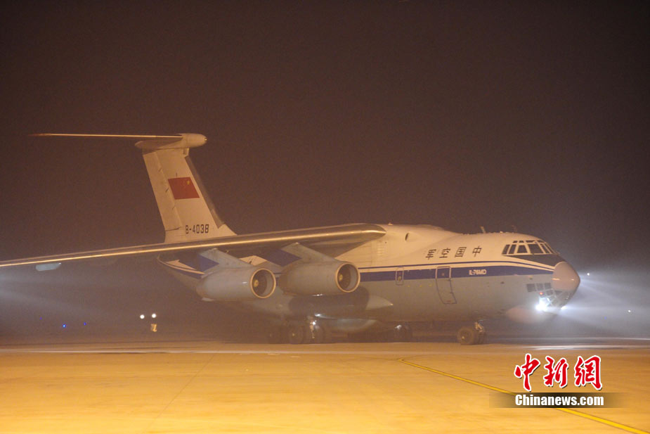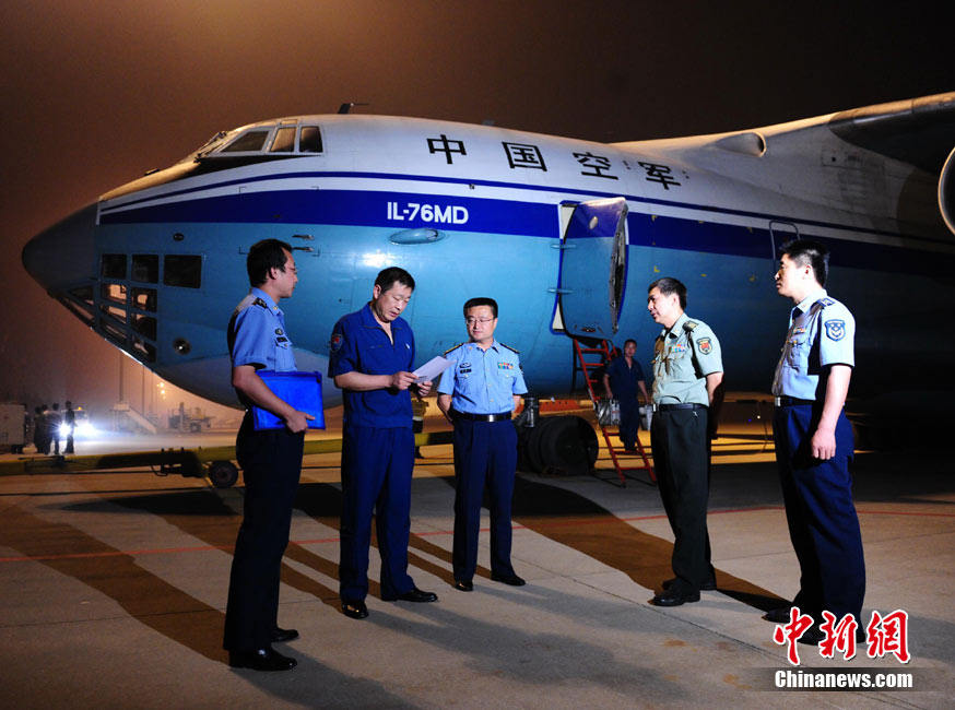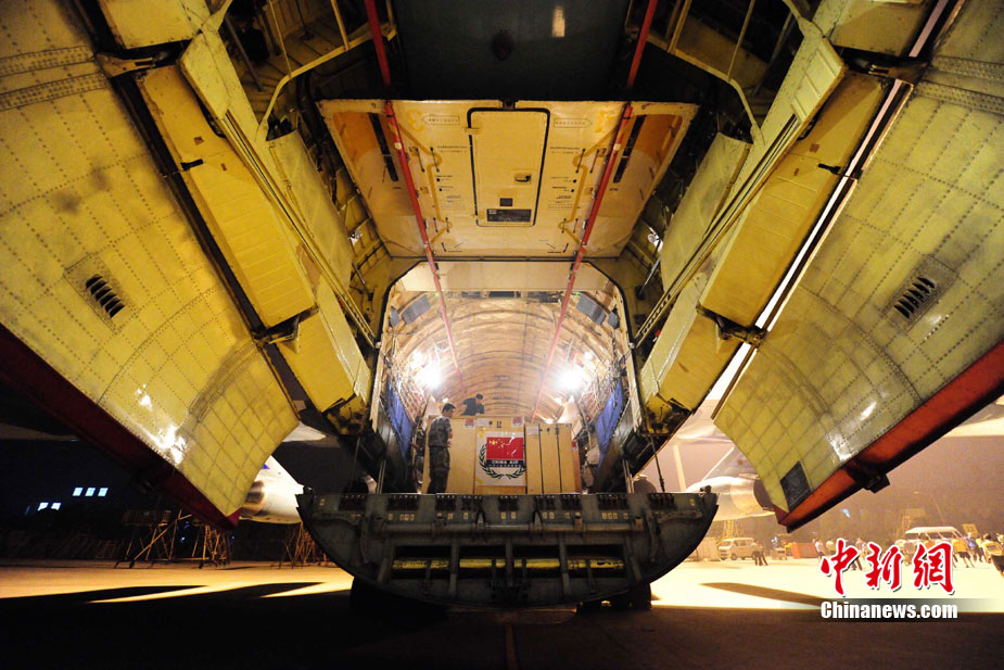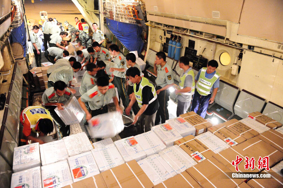 8月3日深夜,中國政府緊急援助巴基斯坦人道主義物資在河北省石家莊機場連夜裝機,準備于4日通過中國空軍飛機運往伊斯蘭堡。這批物資包括30噸藥品和凈水設備、1000頂帳篷、50臺發電機等,總價值約1000萬元人民幣。 中新社發 侯宇 攝