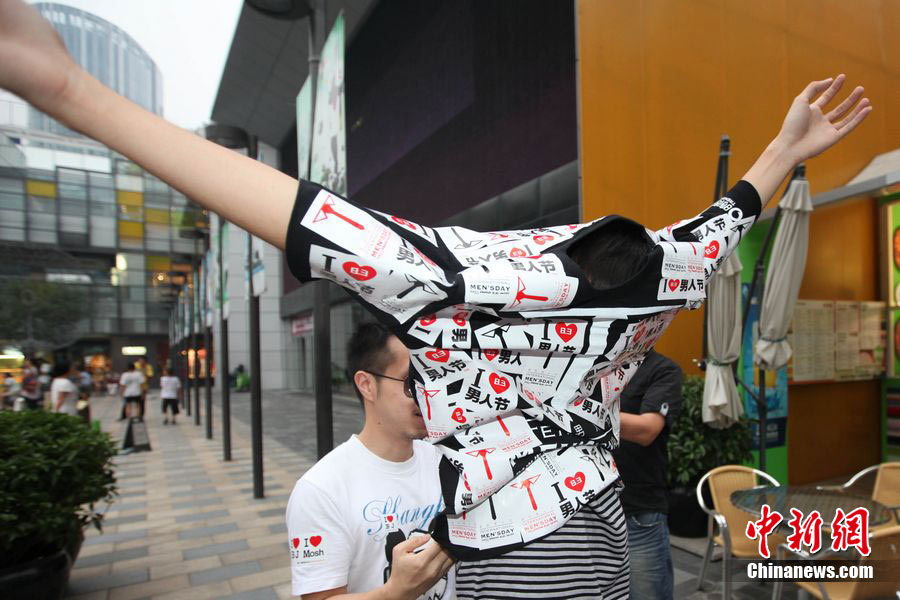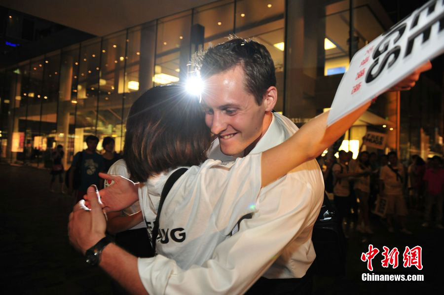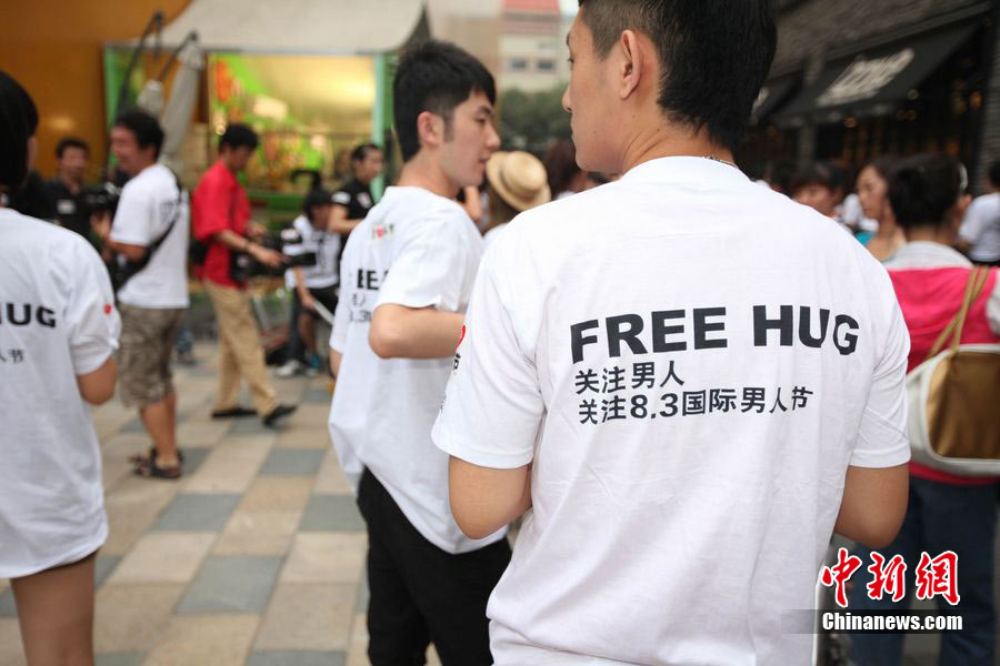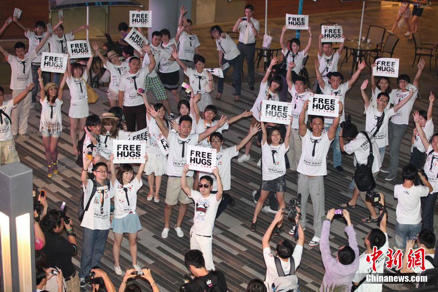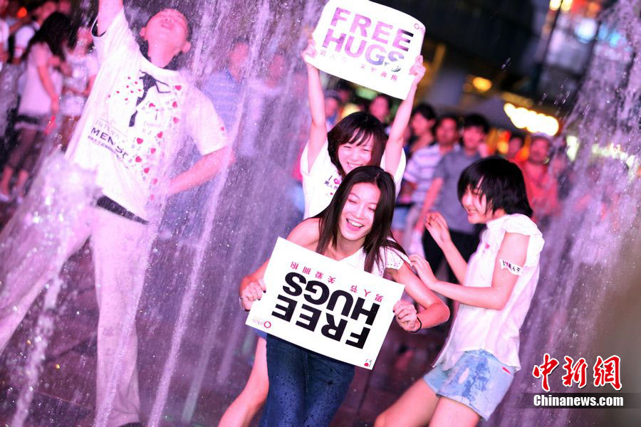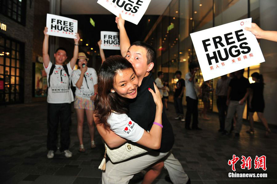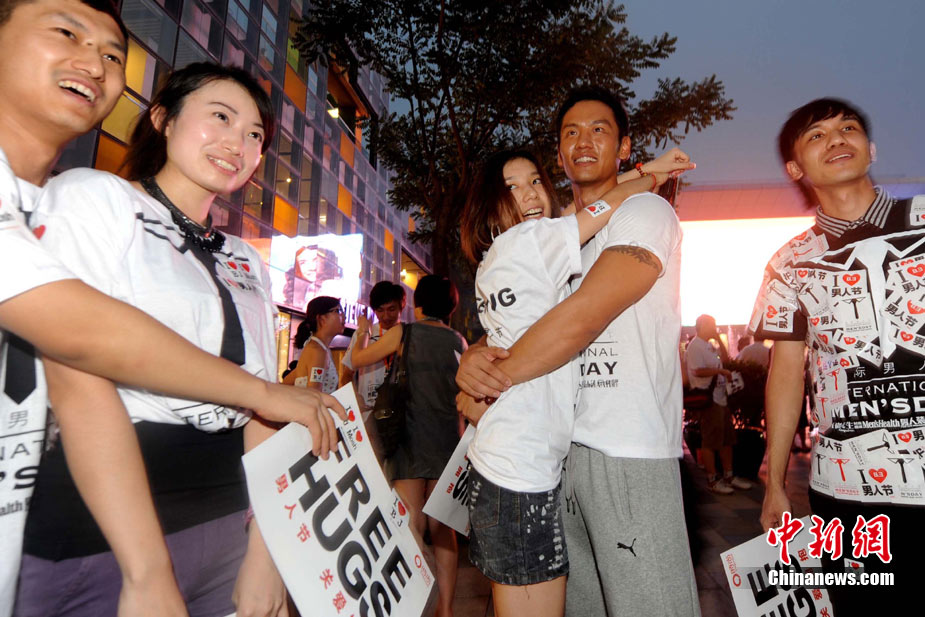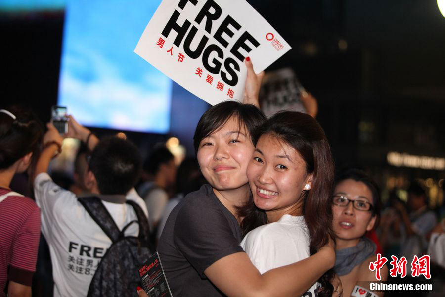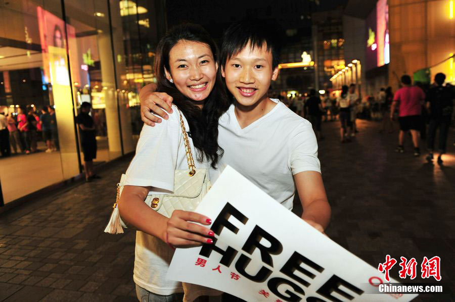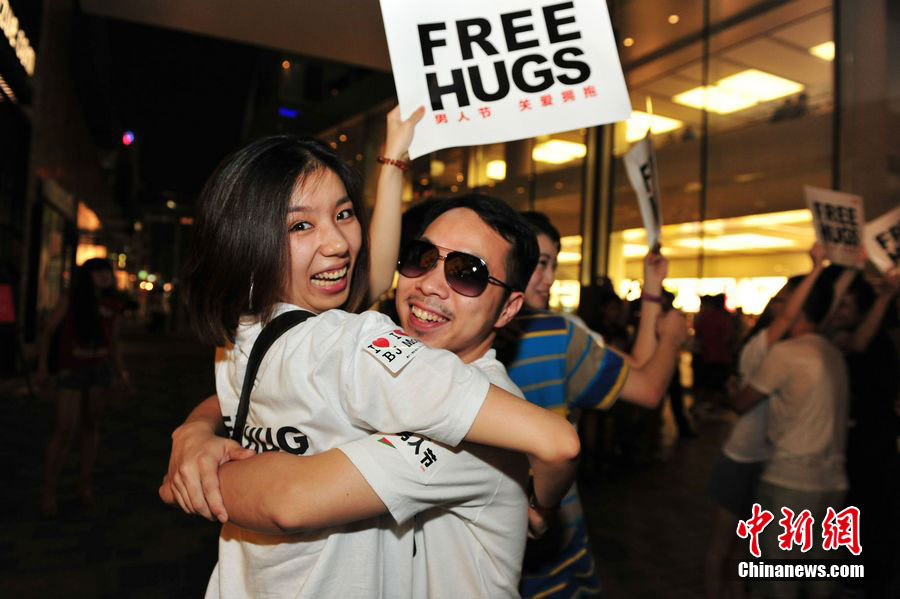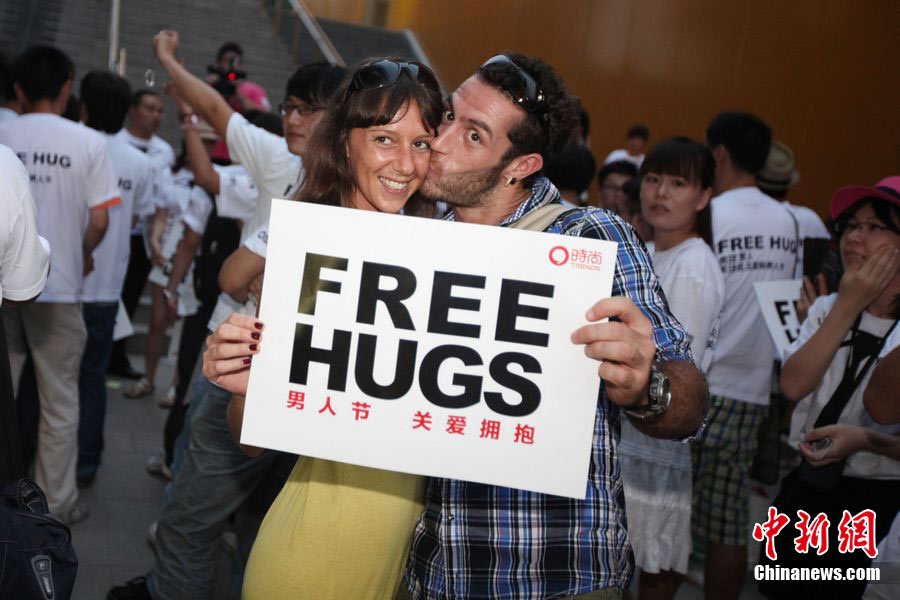 8月3日晚,在北京三里屯,俊男靚女們舉起Free Hug(免費的擁抱)的大牌子,向陌生人們發起了自由擁抱的邀請,現場千人不分男女老少相互擁抱致意。“Free Hug”活動起源于歐美,是一種倡導關心和理解的交流方式。中新社發 李學仕 攝