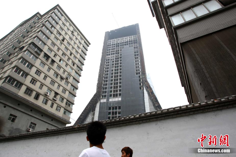 8月11日,中央電視臺電視文化中心工程(北配樓)拆卸復建施工正式啟動。據了解,當日啟動的是金屬幕墻和網架的拆卸。由于主題結構未受到嚴重影響,因此復建后的大樓將基本保持“原樣”。這標志著2009年2月9日中央電視臺大火一年多后,央視新址北配樓終于正式進入拆卸復建階段。中新社發 富田 攝