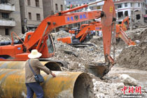 8月14日,四川德陽綿竹市清平、天池等山區遭遇暴雨泥石流襲擊,災害發生后,德陽消防出動車輛20臺次,消防官兵123人次,從各類災害事故中營救被困群眾26人,疏散群眾18人。圖為公安、消防、武警聯手營救被困村民。中新社發 沈消軒 攝