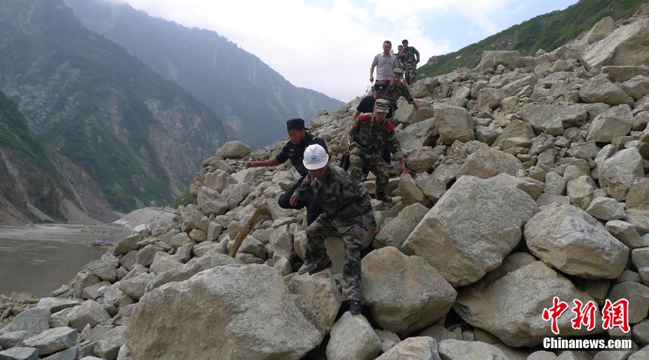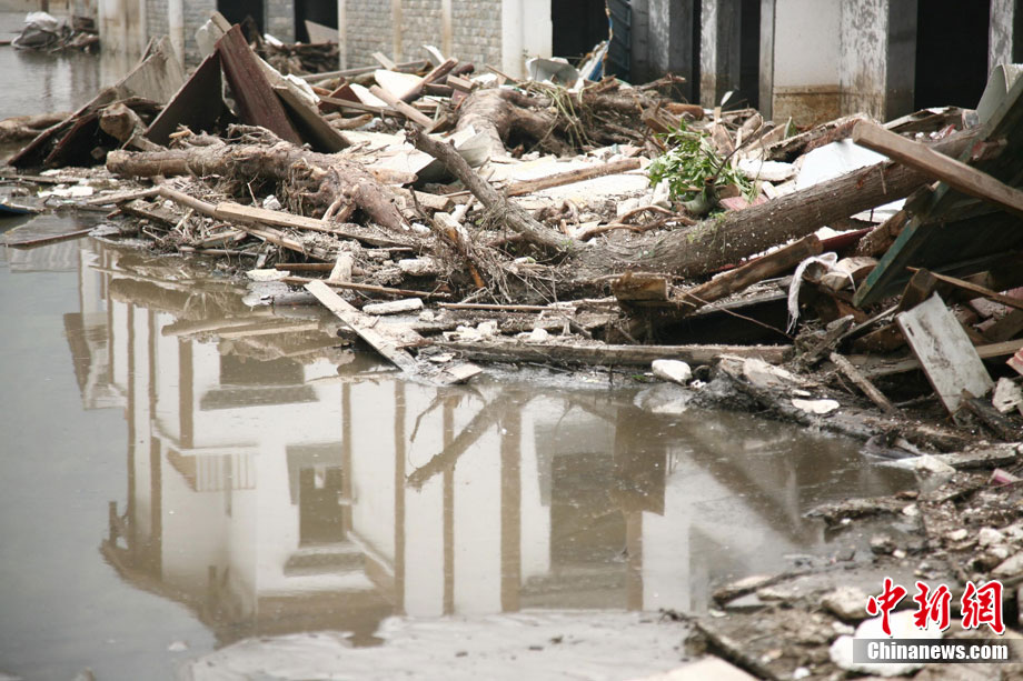 8月16日,發生泥石流災害已經兩天的四川省汶川縣映秀鎮新城,洪水水位略有下降,搶險人員還正全力自處置堰塞體。圖為被洪水圍困的映秀新城。中新社發 張浪 攝