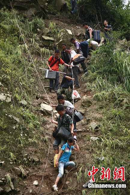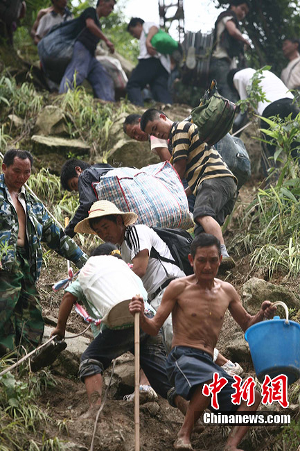8月18日,汶川地區普降暴雨,岷江河水位再度上漲,由于汶川境內213國道仍然處于中斷狀態,受災群眾依然只能徒步翻山越嶺撤離家園,部分山勢陡峭,群眾只能靠繩索通往。中新社發 張浪 攝