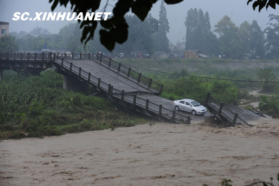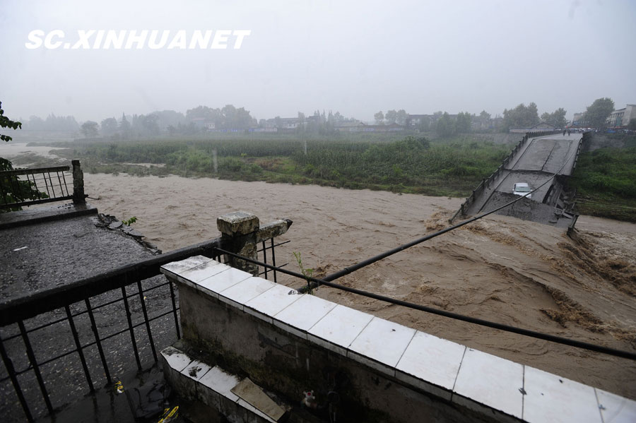 8月19日晚10時許,洪峰再次通過汶川縣映秀鎮(zhèn),突如其來的洪峰沖垮了映秀鎮(zhèn)堰塞體旁的防護(hù)欄,造成該段岷江水位下降,湍急的水流轉(zhuǎn)向沖刷映秀鎮(zhèn)新城河堤,搶險隊已用裝有石料的鐵絲網(wǎng)圍住河堤以保護(hù)映秀鎮(zhèn)新城。圖為已沖毀的岷江防護(hù)欄。中新社發(fā) 張浪 攝