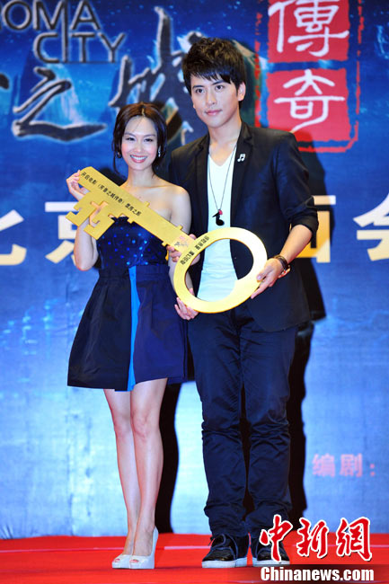 8月25日,電影《芳香之城傳奇》在北京舉行記者會。不老的“紫霞仙子”朱茵攜主演扎西頓珠、張達明、李子雄、張璇、董立范等亮相。朱茵以一襲抹胸短裙亮相,自曝在新片中大轉型,飾演一個有天然體香的神秘啞女,男主角扎西頓珠飾演的“富二代”被其吸引后,上演了一段純美姐弟戀。朱茵在接受采訪時坦言自己并不拒絕姐弟戀。圖為朱茵、扎西頓珠現場秀親昵。中新社記者 李學仕 攝