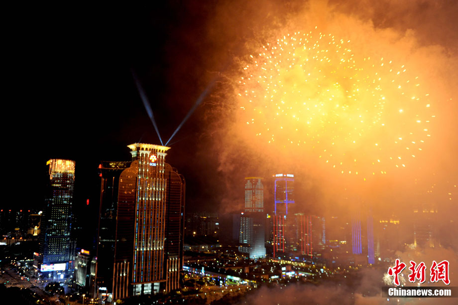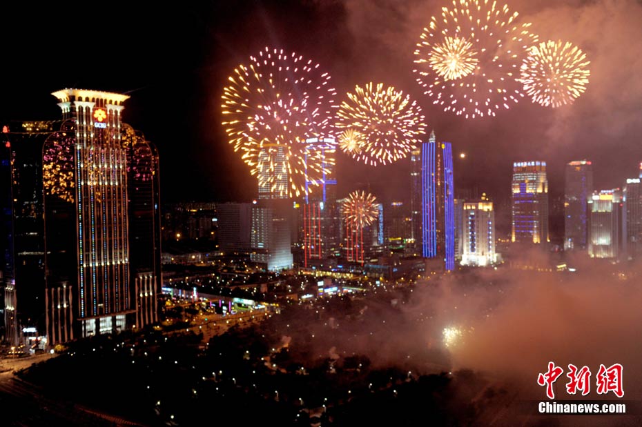 9月6日晚8點30分,深圳夜空璀璨絢麗,慶祝深圳經濟特區建立30周年焰火晚會在深南大道水晶島舉行。今晚燃放煙花數量145107發,主要品種19種,全長30分鐘,共四個樂章。深圳市民分別在蓮花山公園、市民中心、深南路、彩田路、會展中心等區域觀看深圳經濟特區30周年慶典煙花晚會。中新社記者 陳文 攝
