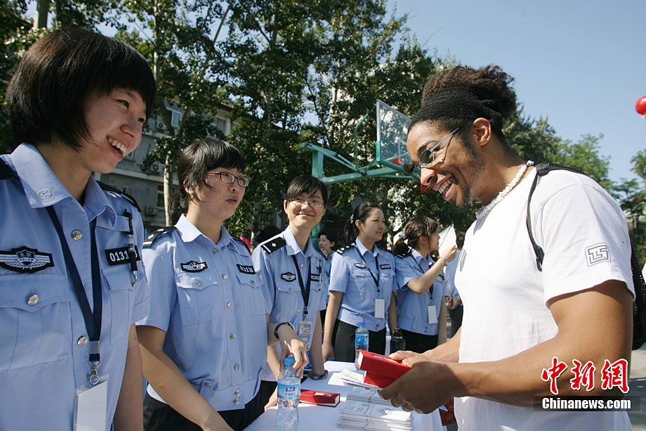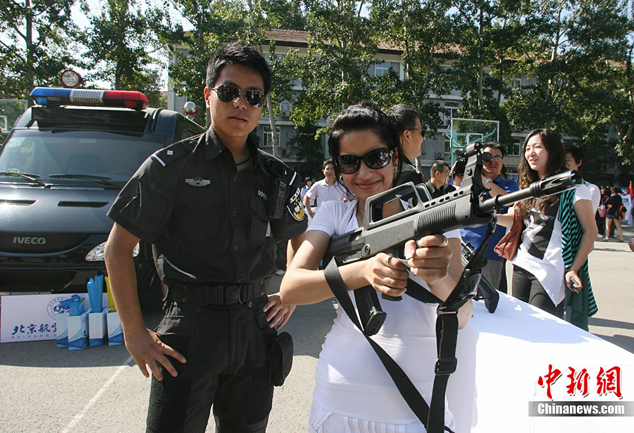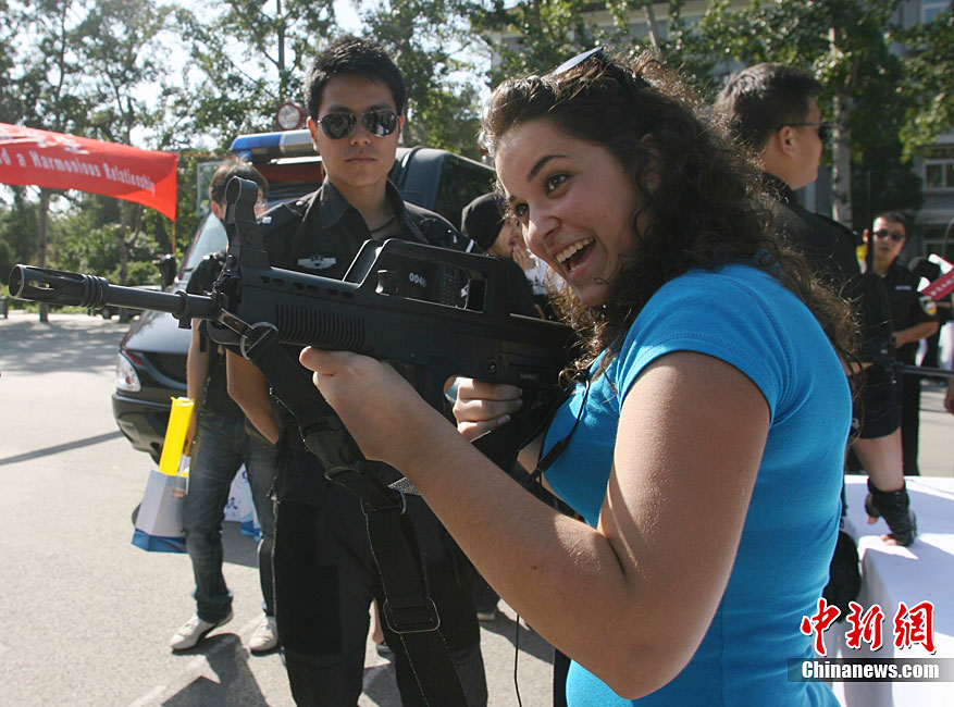9月11日,北京語言大學(xué)一留學(xué)生在北京特警的講解下試用新型警用槍支。當(dāng)日,北京市公安局在北京語言大學(xué)舉辦“平安北京進校園”主題活動。民警通過面對面的交流為外國留學(xué)生提供咨詢服務(wù),用英、德、西、日、韓5種語言,解答外國留學(xué)生在京居留、學(xué)習(xí)生活方面的各種問題,致力于提高外國留學(xué)生的安全感和滿意度。中新社發(fā) 蘇丹 攝