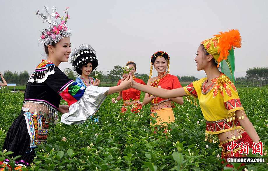 9月11日,“中國茉莉之鄉(xiāng)”廣西南寧橫縣,少數(shù)民族美女在“中華茉莉園”忙采茶。9月10日至12日,由中國花卉協(xié)會花文化專業(yè)委員會、中國茶葉流通協(xié)會茶館專業(yè)委員會和南寧市人民政府主辦的2010年中國國際茉莉花文化節(jié)在廣西橫縣舉行。橫縣是世界最大的茉莉花生產(chǎn)和花茶加工基地,茉莉花種植面積達到10萬畝,花農(nóng)33萬人,年產(chǎn)鮮花8萬多噸,茉莉花產(chǎn)量和花茶加工總量均占全國80%以上,占世界的60%。中新社記者 楊志雄 攝
