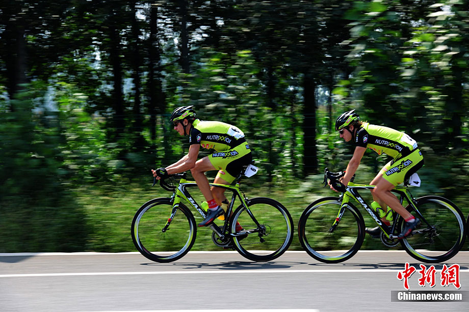 9月12日上午,首屆環(huán)中國(guó)國(guó)際公路自行車賽進(jìn)入第二賽段,由西安前往華山,全程118公里。圖為德國(guó)紐特里什車隊(duì)的一些選手們?cè)诟咚俟飞巷w速前進(jìn)。中新社記者 侯宇 攝
