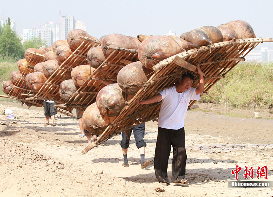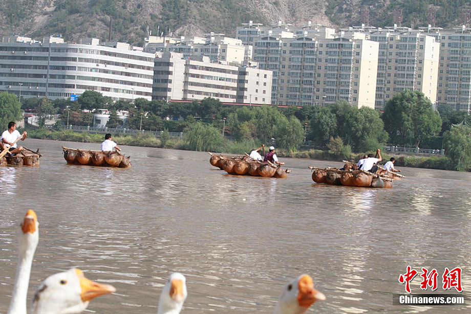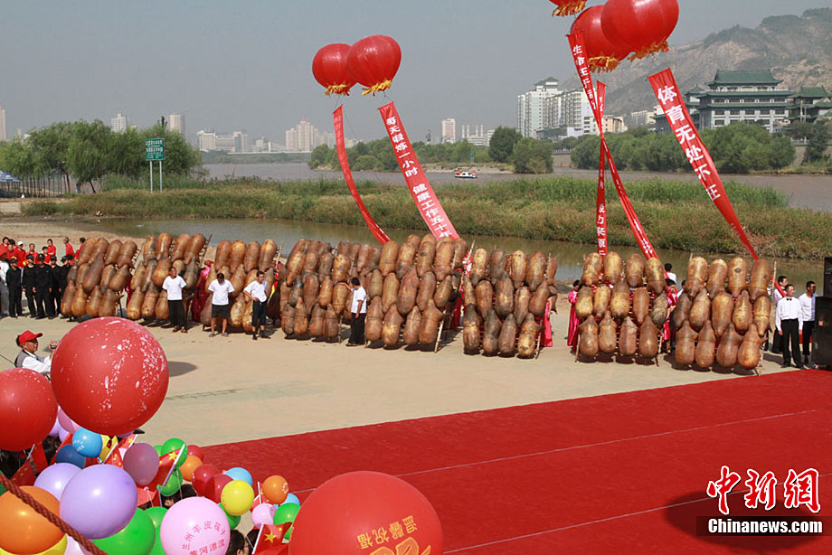 9月13日,蘭州第二屆羊皮筏子黃河漂流活動隆重舉行。羊皮筏子俗稱“排子”,是用山羊割去頭蹄,然后將囫圇脫下的羊皮扎口、吹滿氣而扎成,是一種古老的水運工具,如今已經被淘汰,嬗變成當地一種旅游項目。中新社記者 殷春永 攝
