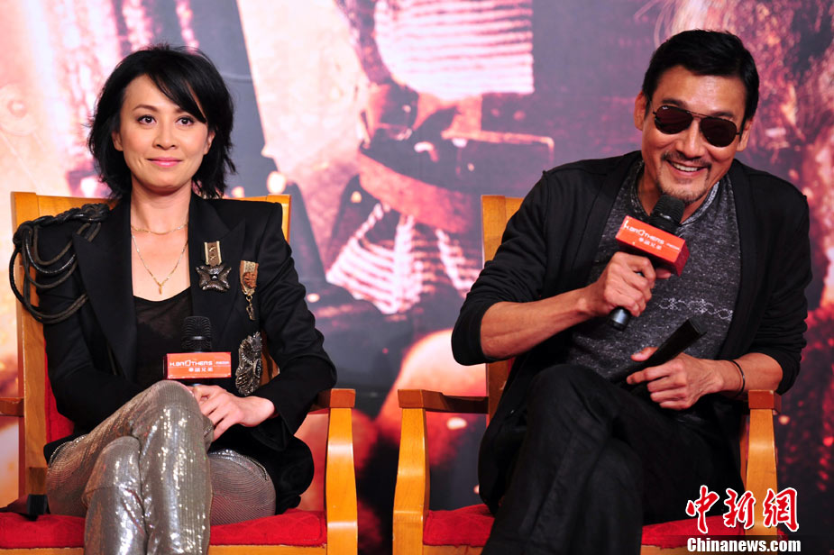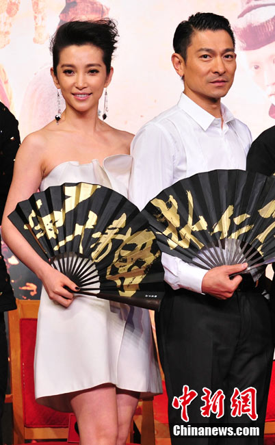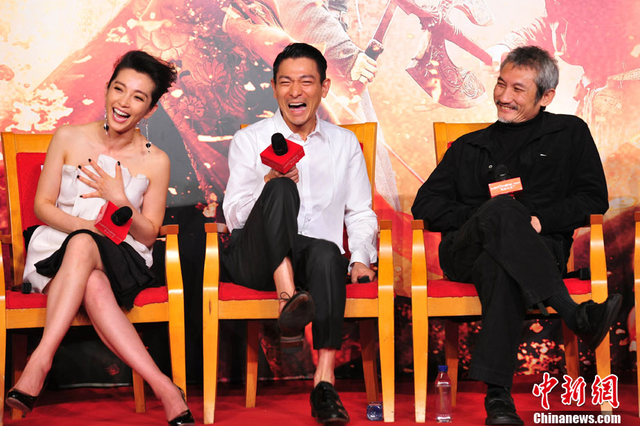 9月19日,由徐克導演、陳國富監制、洪金寶擔任武術指導的華誼兄弟大片革命之作《狄仁杰之通天帝國》在京舉行亞洲首映發布會。導演徐克攜主演劉德華、李冰冰、劉嘉玲、梁家輝、鄧超全陣容亮相,這也是五大主演首次同臺宣傳。主演狄仁杰的劉德華在現場大開玩笑,多次引爆笑彈。該片將于9月29日上映。圖為劉德華扮起觀音姿勢。中新社記者 李學仕 攝