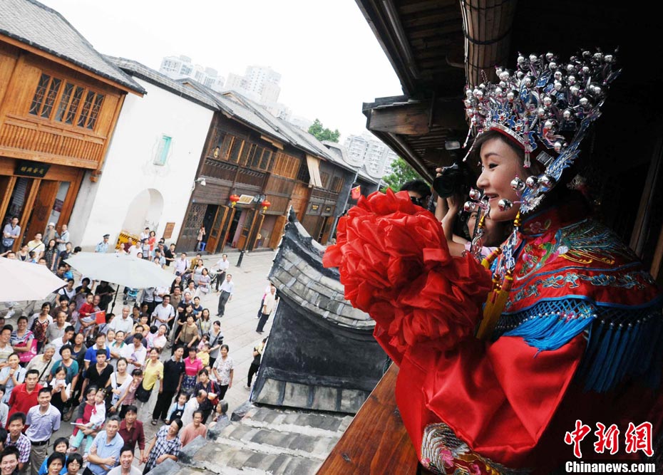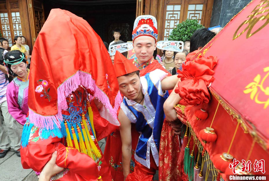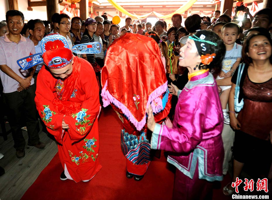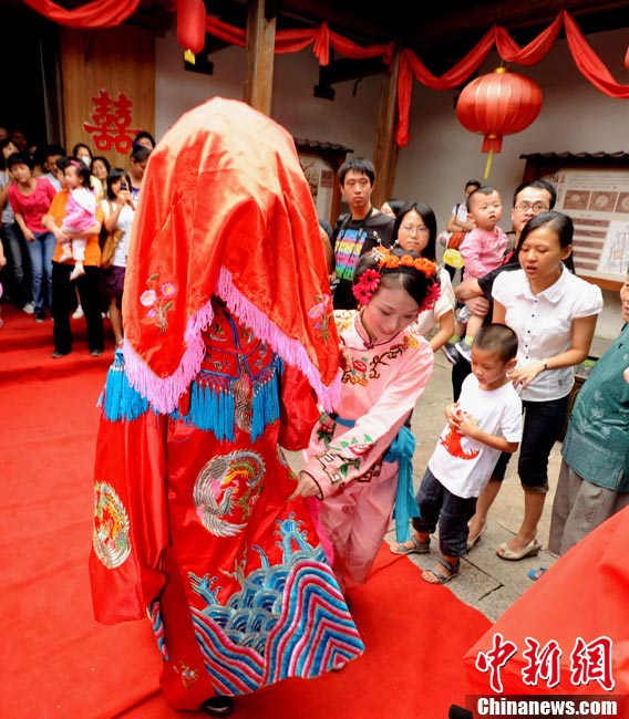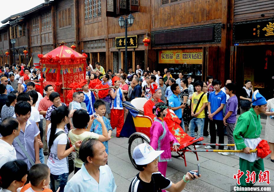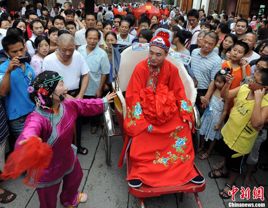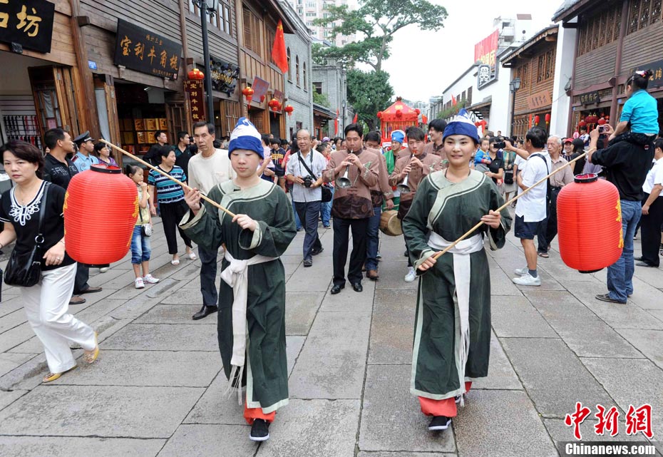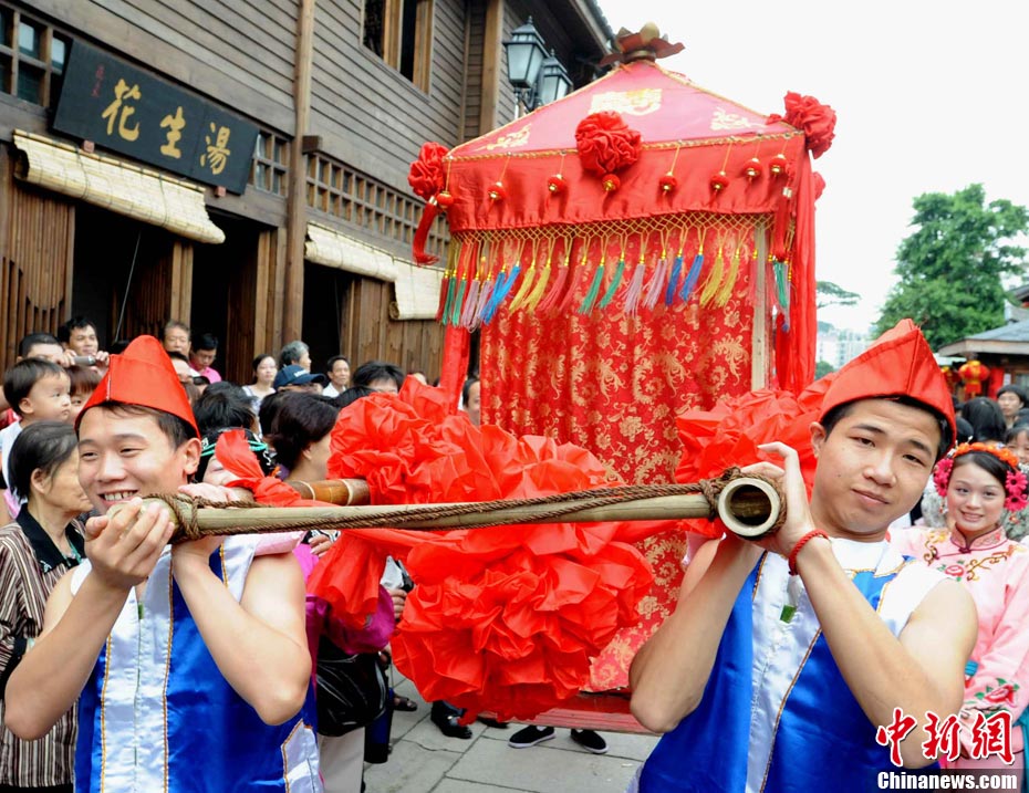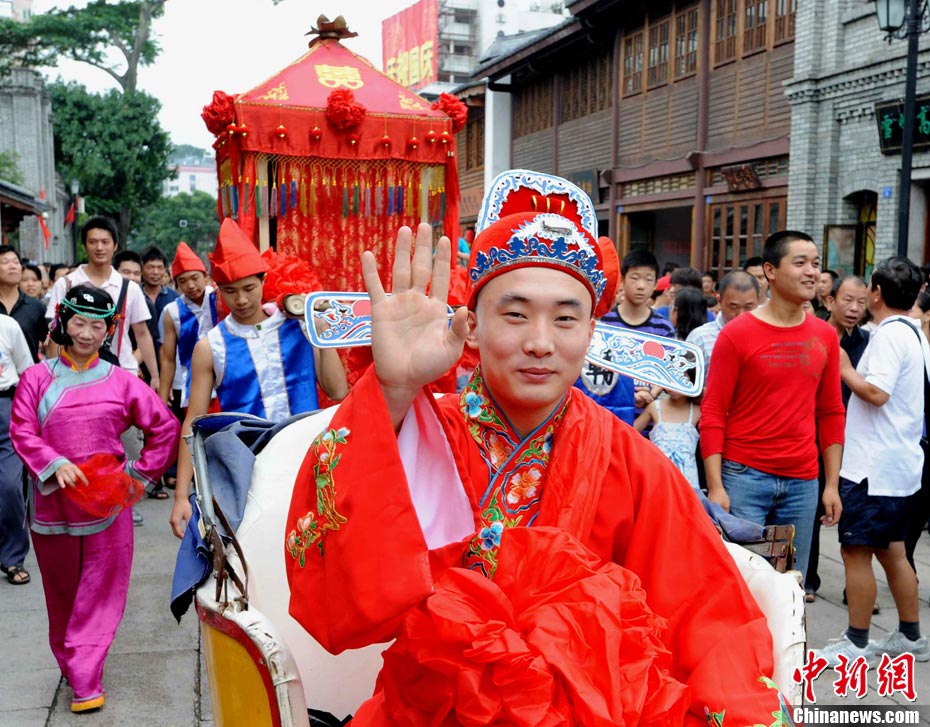 10月1日國慶節,福州古街上演一場傳統民俗婚禮令眾多游客爭睹。該傳統民俗婚禮分起轎、回車馬、迎轎、下轎、祭拜天地、入洞房等場面喜慶。