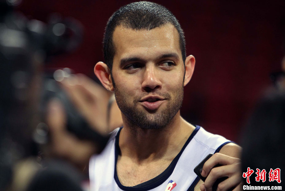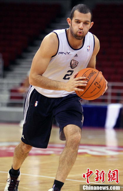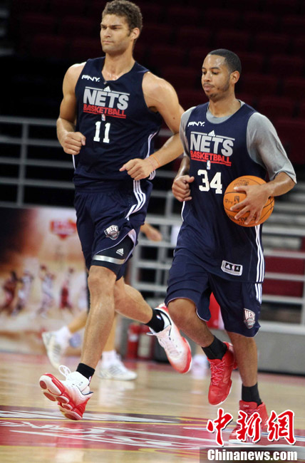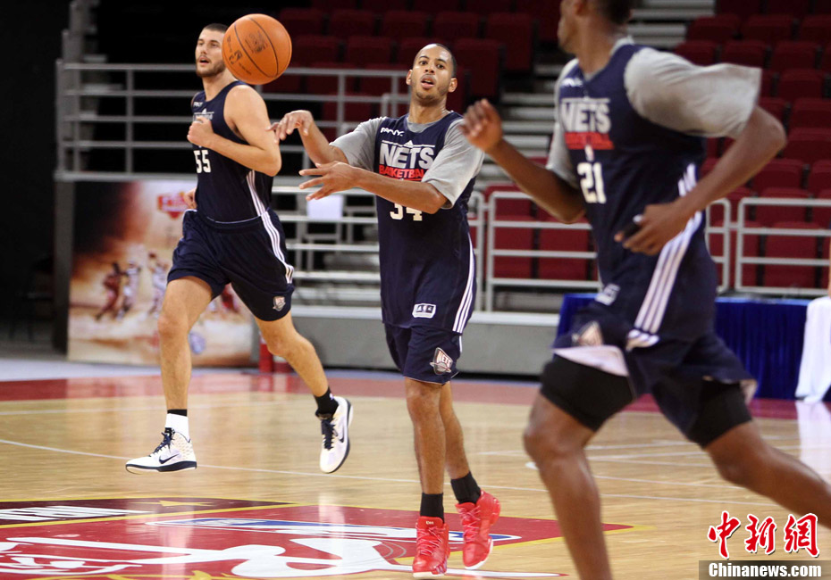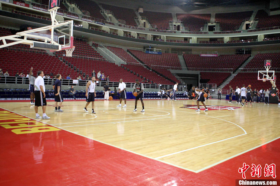 10月12日中午,新澤西網(wǎng)隊在北京五棵松體育館訓(xùn)練并接受了媒體采訪;火箭隊則由于凌晨剛剛抵達(dá)北京而取消了訓(xùn)練。據(jù)悉,兩場比賽的門票已經(jīng)售罄。中新社記者 任晨鳴 攝