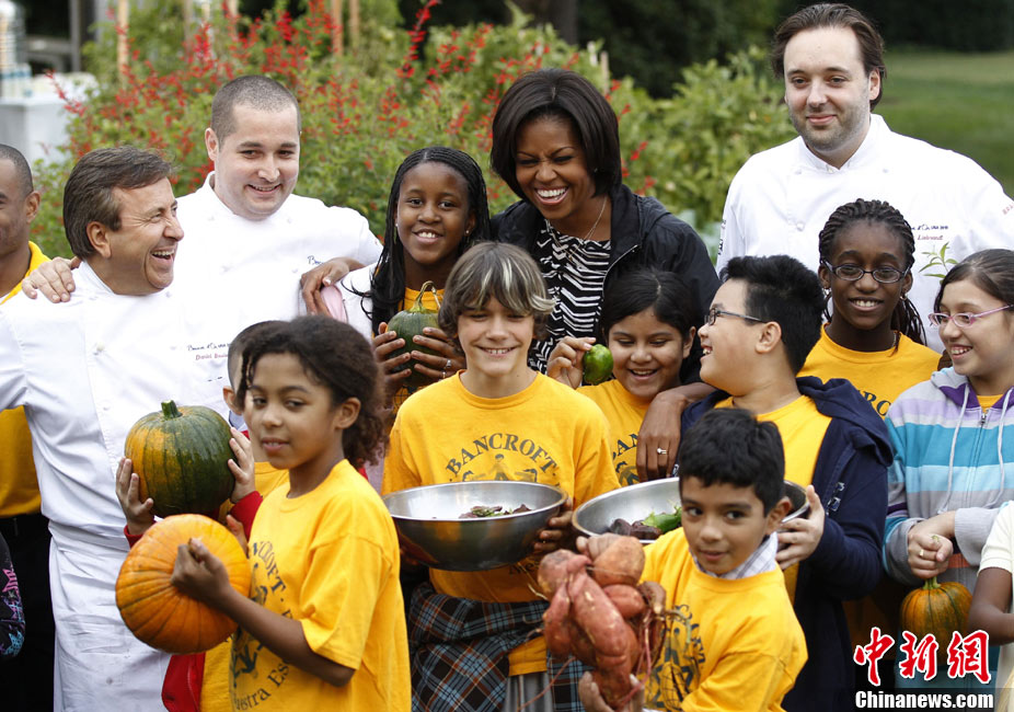 10月20日,美國華盛頓,美國第一夫人米歇爾·奧巴馬與小學生一起收獲白宮菜園里種植的菜蔬。