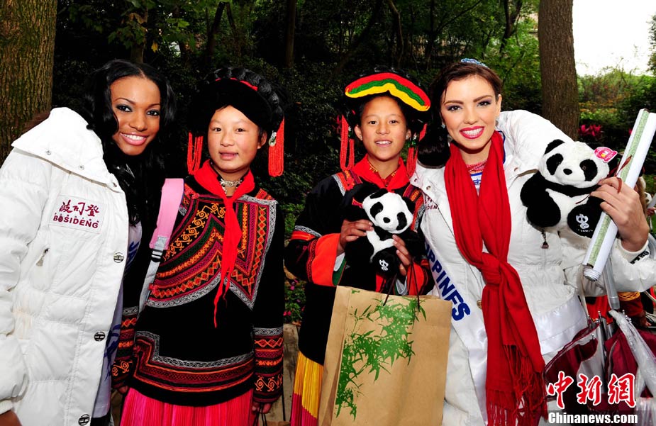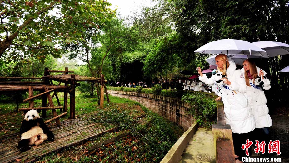 10月26日,參加第50屆國(guó)際小姐世界大會(huì)全球總決賽的70多位佳麗,來(lái)到成都市大熊貓繁育研究基地,參加擁抱熊貓嬌子活動(dòng)。 中新社發(fā) 安源 攝