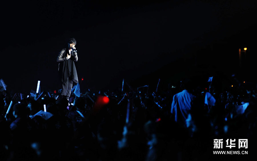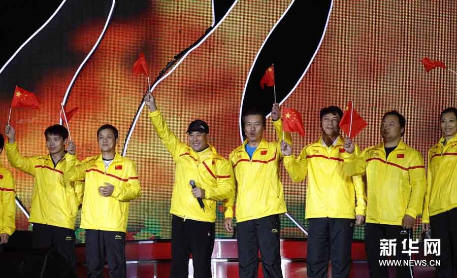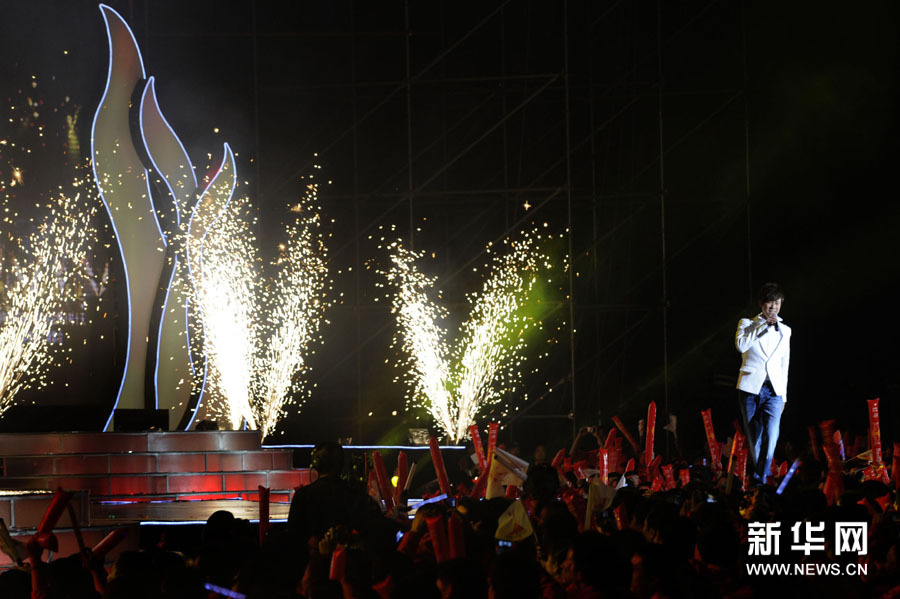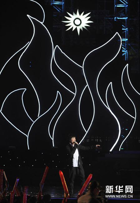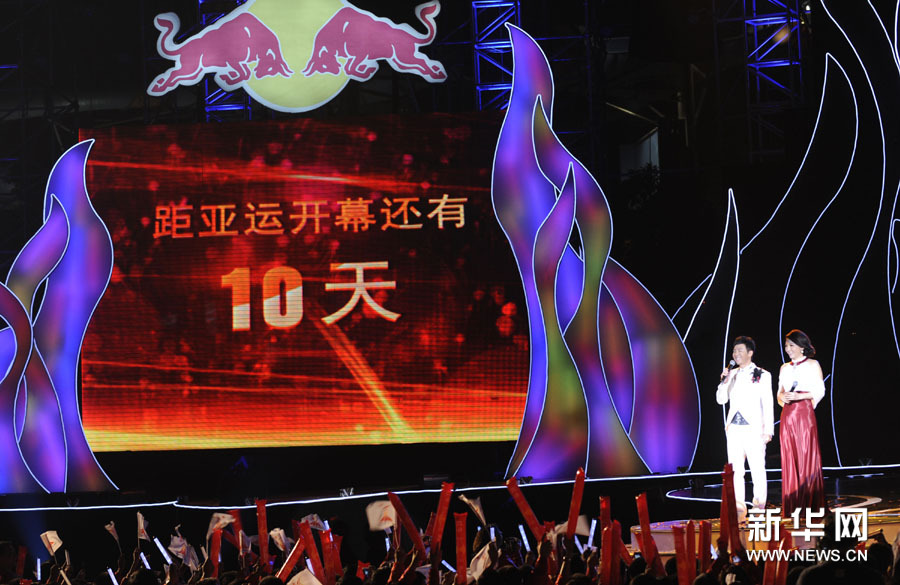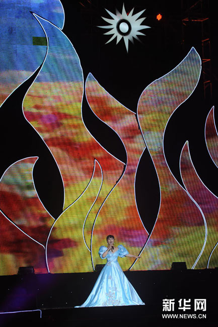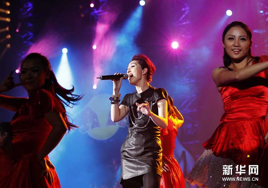 11月2日,歌手楊千嬅(中)在晚會上演唱。當日,2010廣州亞運會倒計時10天主題歌會在廣州舉行,來自內地、香港的明星和中國羽毛球隊一起唱響激情亞運。孟永民攝 圖片來源:新華網