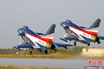 11月初,中國空軍八一飛行表演隊新涂裝的殲10飛機雙機起飛。空軍八一飛行表演隊7架殲—10戰機近日將飛赴珠海,參加11月16日至21日舉行的第8屆中國國際航空航天博覽會(珠海航展)。這是表演隊換裝殲—10戰機后,首次以新涂裝向世人正式亮相。空軍還將派出殲—8F、殲轟—7A、轟—6H、空警—200、直—8KA、直—9WA等7型飛機,參加這次國際性綜合航展。中新社發 譚超 攝