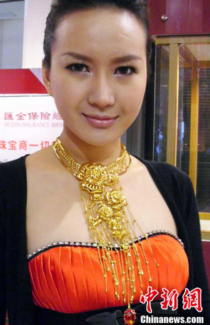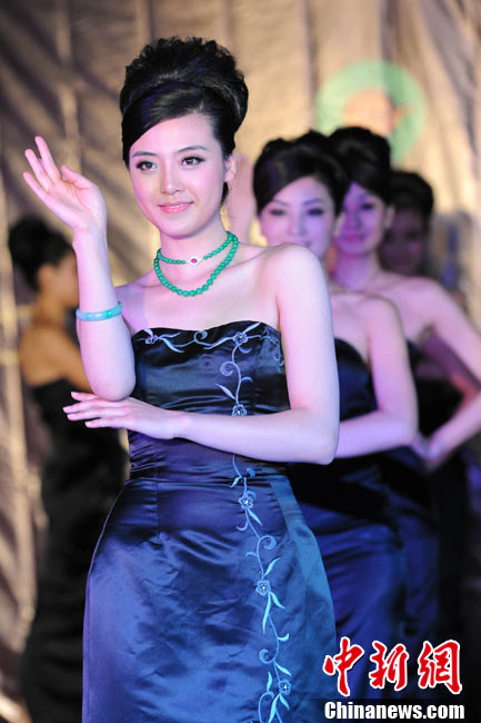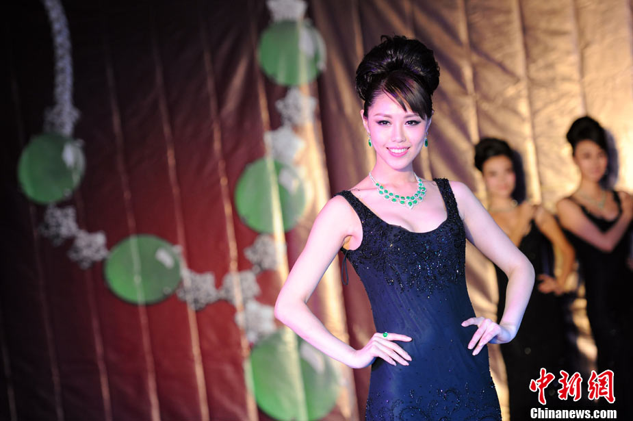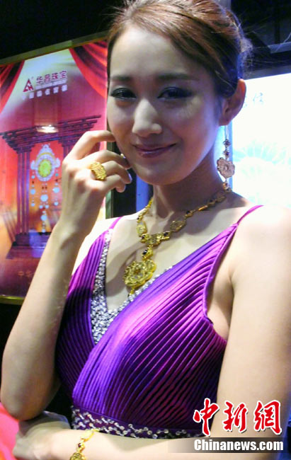11月11日,2010中國國際珠寶展在北京中國國際展覽中心開幕,本屆展會規模42000平方米,近2000個展位,有來自22個國家和地區的961家企業參展,展覽面積比去年同期擴大了40%。圖為2010中國國際珠寶展上模特展示珠寶首飾。中新社記者 錢興強 攝