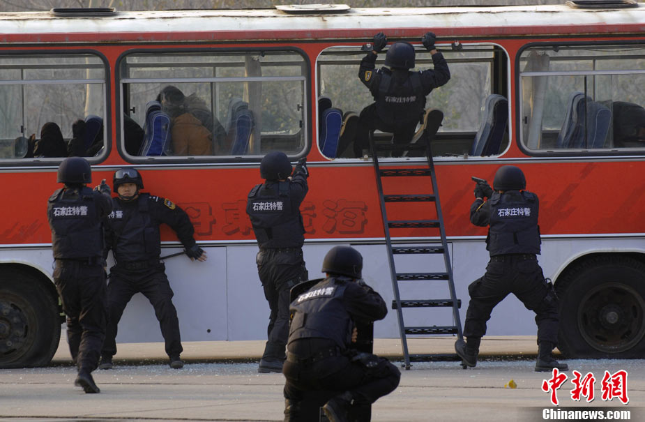 11月16日,河北石家莊特警、治安警、刑警、武警、交警、消防等多警種聯(lián)動,舉行代號為“紅箭突擊——2010”大型反恐處突應(yīng)急拉動演練。據(jù)指揮部有關(guān)負(fù)責(zé)人介紹,此次演練從實戰(zhàn)出發(fā),主要分為參演隊伍分列式和處突實兵演練,以檢驗重大案(事)件應(yīng)急處突力量的協(xié)同配合和處置能力。圖為特警“解救”客車上的游人。中新社發(fā) 劉志敏 攝