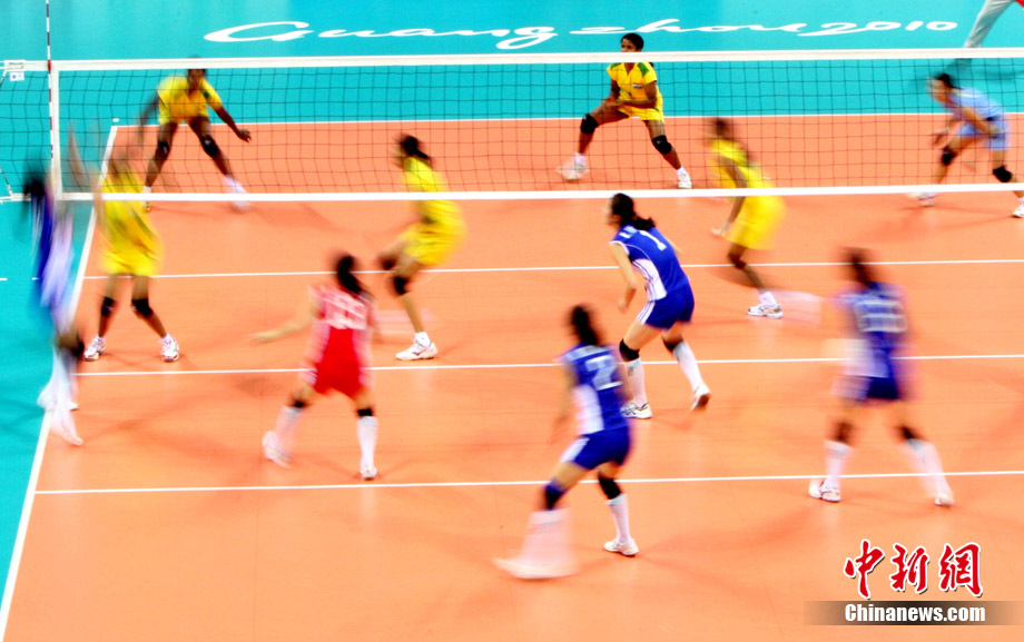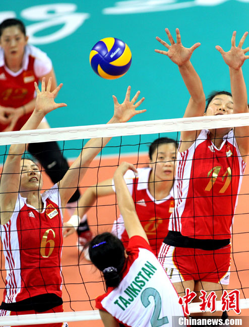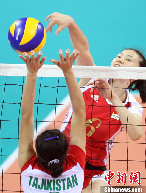 11月18日,廣州亞運會女排比賽全面展開,中國隊首戰迎來塔吉克斯坦隊。最終,中國隊在老將周蘇紅的帶領下,以3比0輕松戰勝塔吉克斯坦隊,迎來開門紅。 中新社記者 湯彥俊 攝