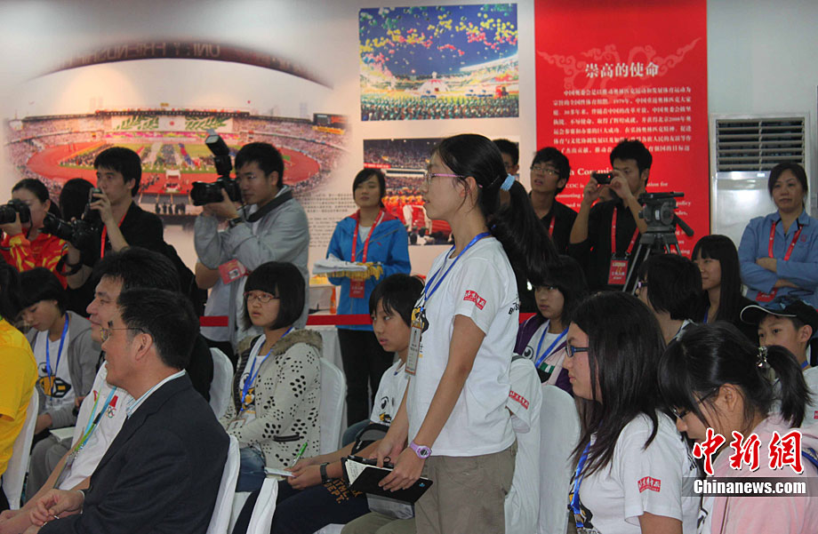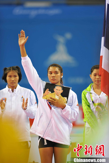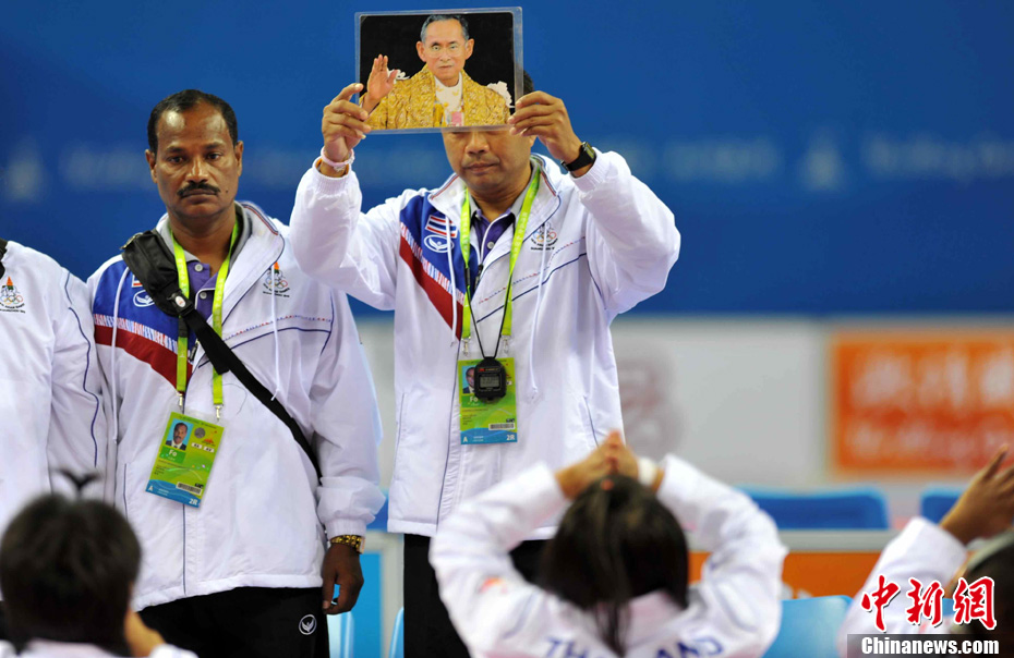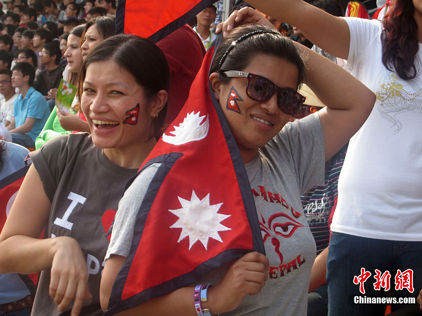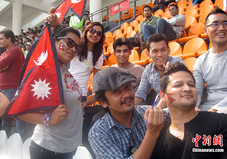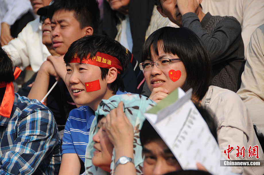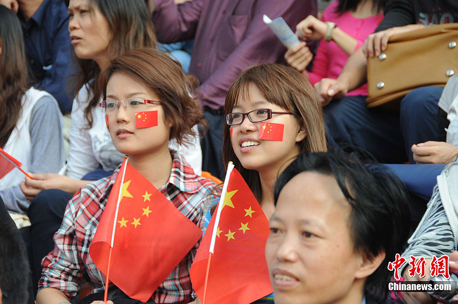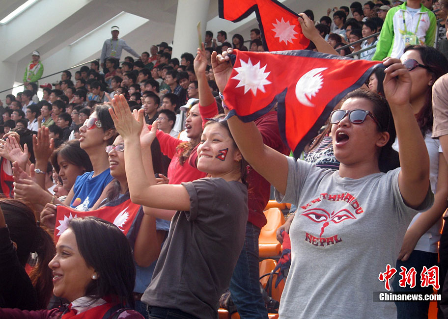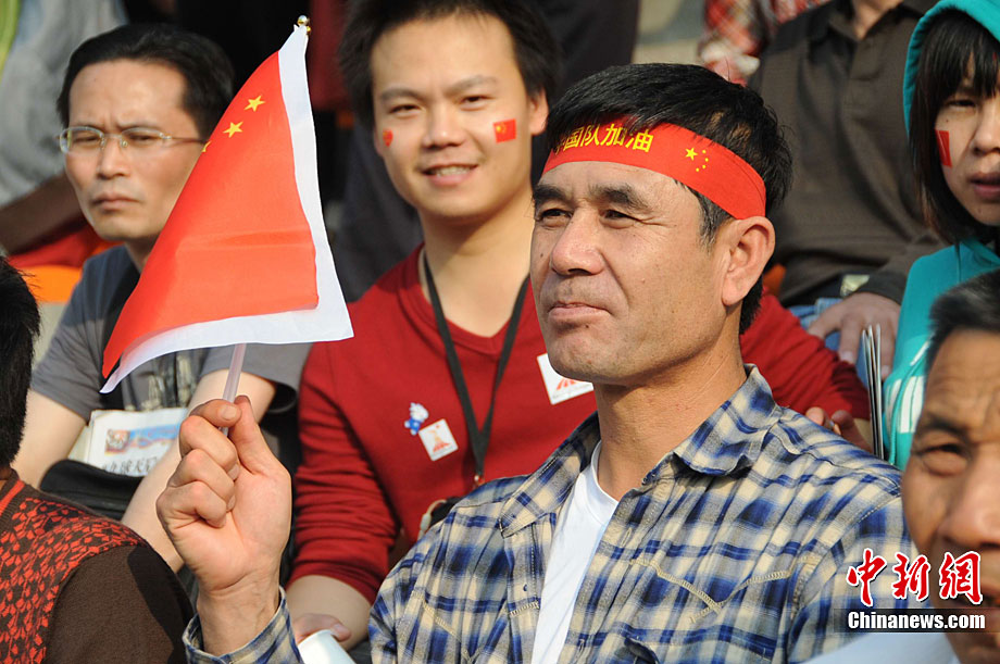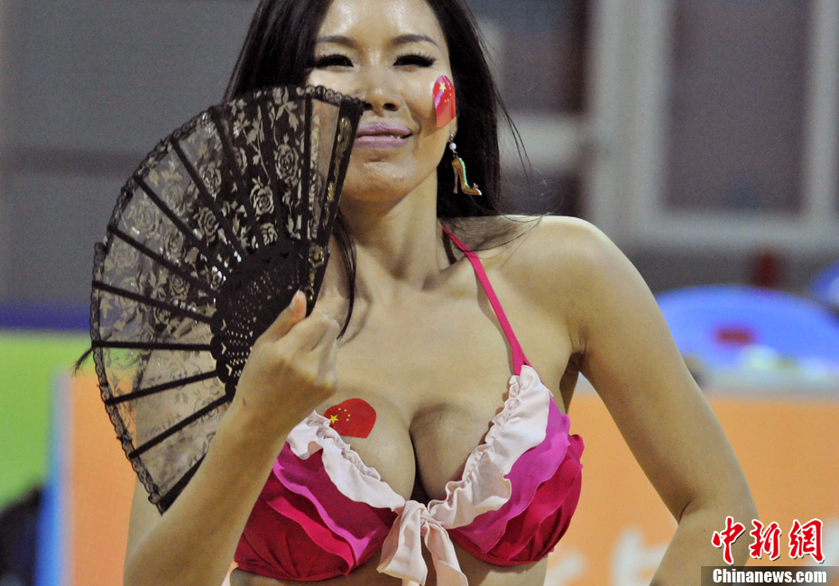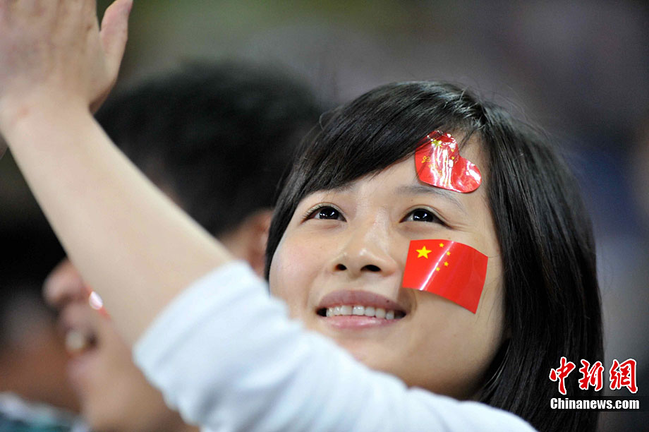 廣州亞運會女子足球賽中國隊與韓國隊的銅牌爭奪戰11月22日在廣州天河體育館開打。圖為賽場上熱情的中國球迷。中新社記者 唐貴江 攝